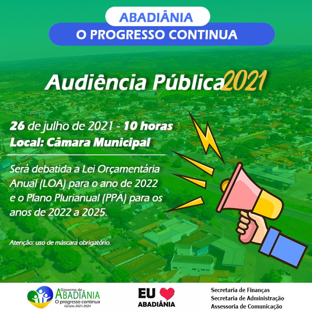 O Governo de Abadiânia vai realizar "Audiência Pública 2021", onde será debatida a Lei Orçamentária Anual (LOA) para o ano de 2022 e o Plano Plurianual (PPA) para os anos de 2022 a 2025.