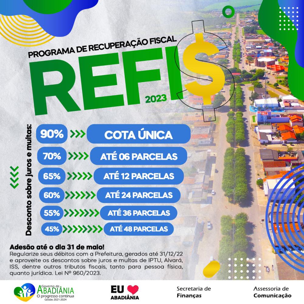 O Governo de Abadiânia, por meio da Secretaria de Finanças, informa que está liberado o Refis 2023, Programa de Recuperação Fiscal do nosso Município.